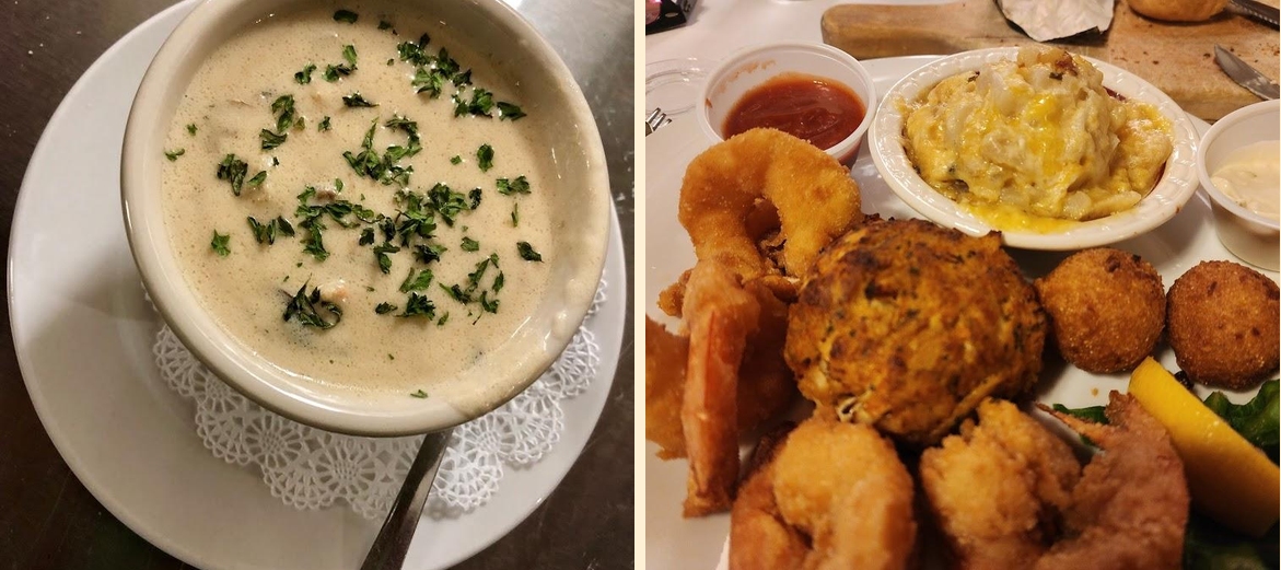 Must-try dishes include Jumbo Shrimp Cocktail, Seafood Chowder, and their Cheesecake for dessert. Bacon Wrapped Jumbo Shrimp is also a favorite.