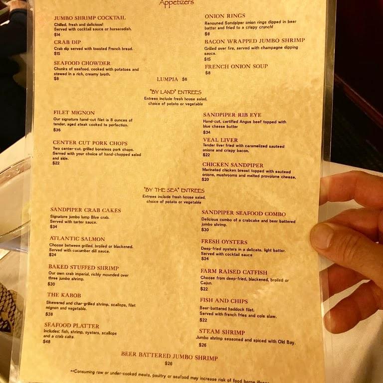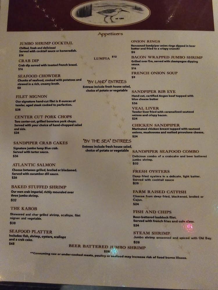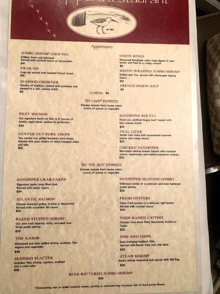 The menu at Sandpiper Restaurant features a rich selection of dishes. From seafood platters showcasing the freshest ocean flavors to land offerings like filet mignon, there's something for every palate. Appetizers like bacon-wrapped shrimp offer a perfect start to any meal.